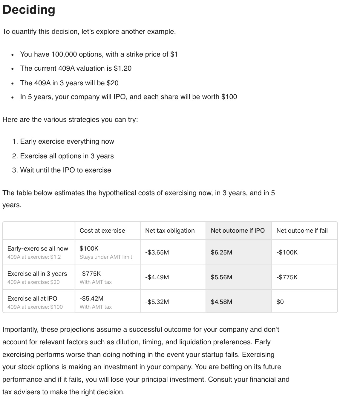 Compound entered the space solving for the employee equity issue. They have published a number of manuals to help tech employees understand the intricacies around stock options. This guide (screenshot below) walks through an example of quantifying your exercise decision looking at 3 scenarios - early exercise (now), exercise in 3 years, and wait until IPO to exercise, to showcase the tax implications and overall returns.